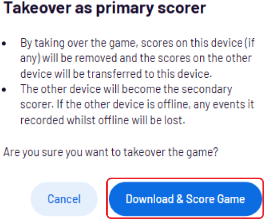 Take over as the Primary Scorer on the same device. 1. Click the three dots (…) in the top-left corner of the screen. 2. Select Change Scoring Status. 3. Choose Takeover as Primary Scorer, then click Takeover Game. 4. Click Download & Score Game. A ...