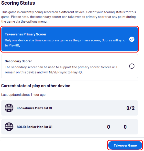 PlayHQ - Take over as Primary Scorer on a Different Device